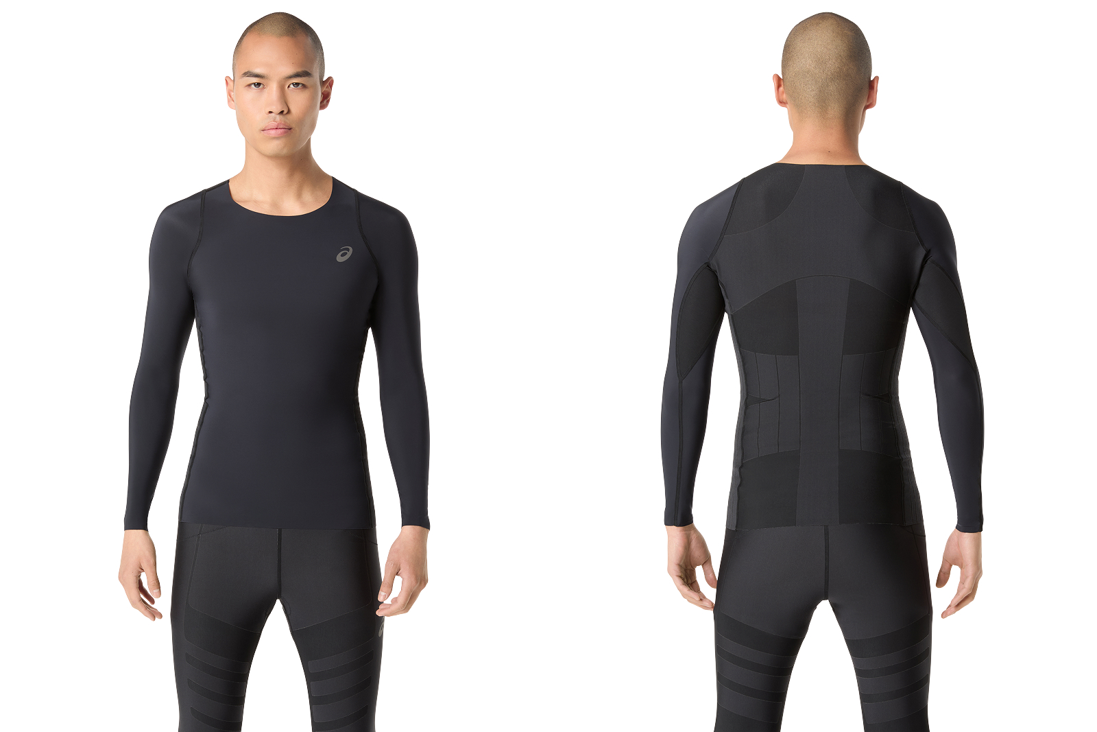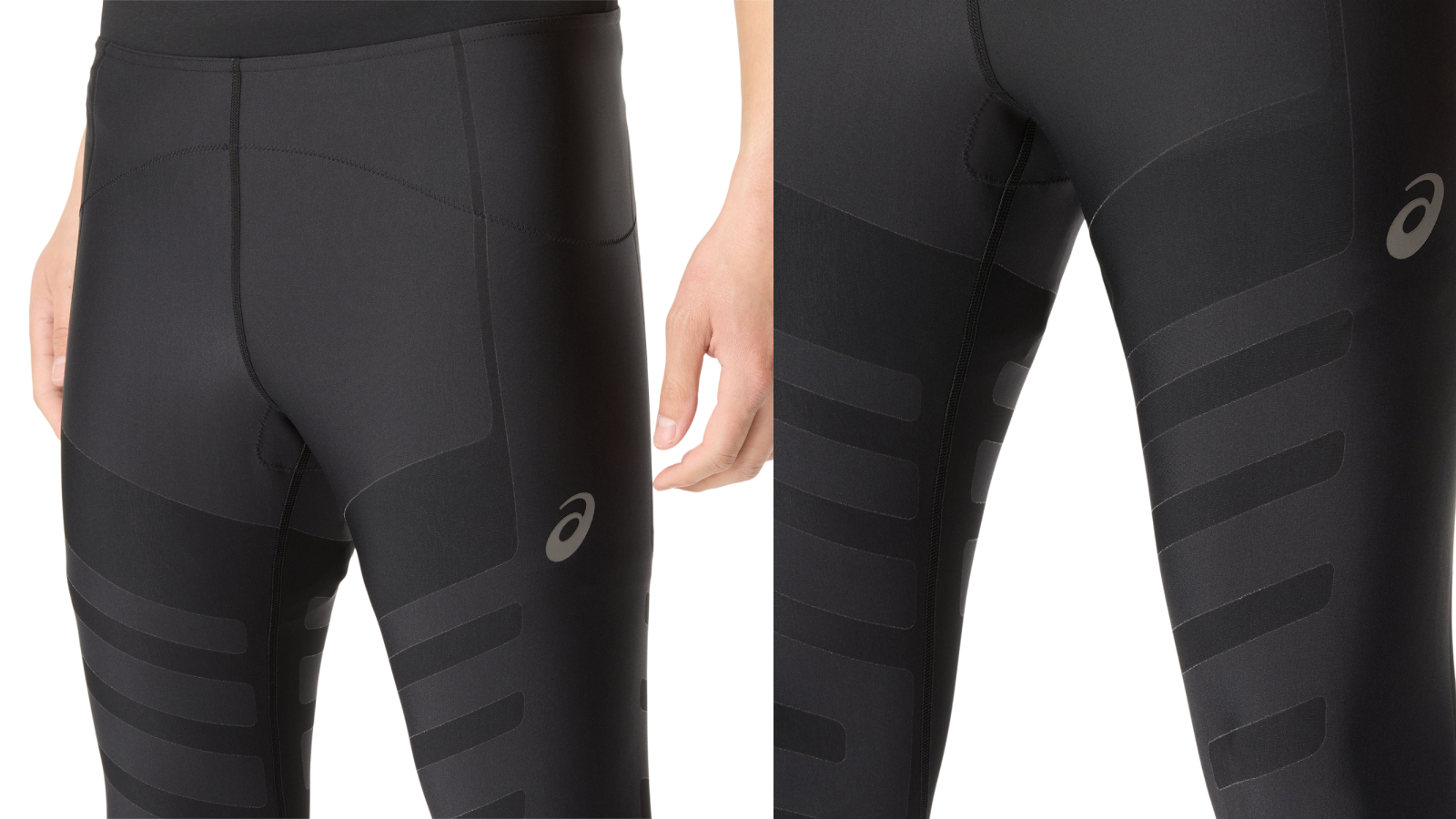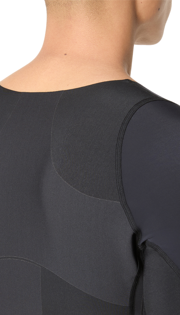 タイツと同じ生地を採用し、「アシックススポーツ工学研究所」の研究で得たデータからコアバランス技術をこちらにも反映させています。特徴的なのは左右の脇下の切り替えと、背中にあるトンボの羽のような形状のコンプレッション部分ですね。それによってお腹や腰周りの安定性を出しています。