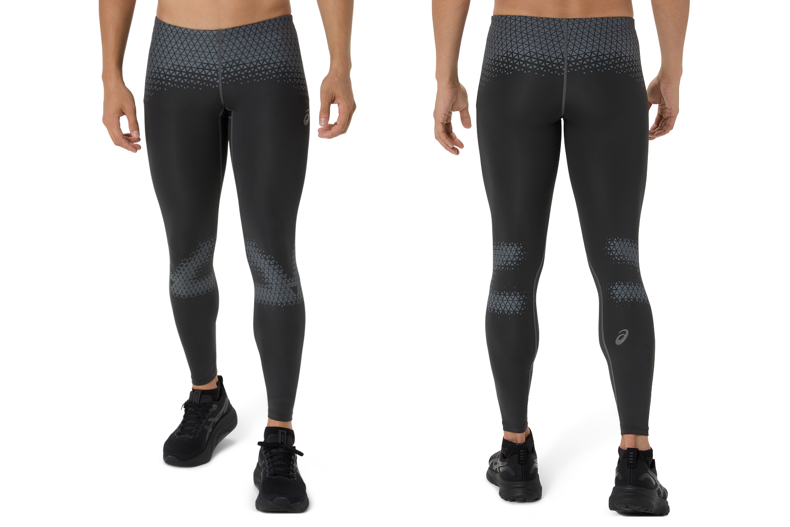 まずは「MMSスタビリティタイツ」をご覧いただきたいのですが、三角形のプリントが腰回りにたくさん配置されていますよね。この形状がコアマッスルに安定性をもたらしているんです。加えて膝にもプリントが施されていますが、お皿を覆い囲むような形にすることで、安定性をサポートしています。この配置に研究の成果があるんです。